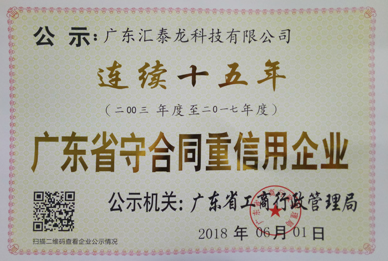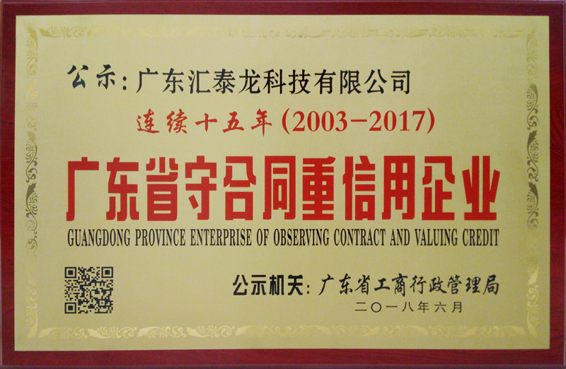 日前,經廣東省工商行政管理局嚴格審核并予公示,廣東匯泰龍科技有限公司被授予“連續15年(2003-2017)廣東省守合同重信用企業”榮譽稱號。