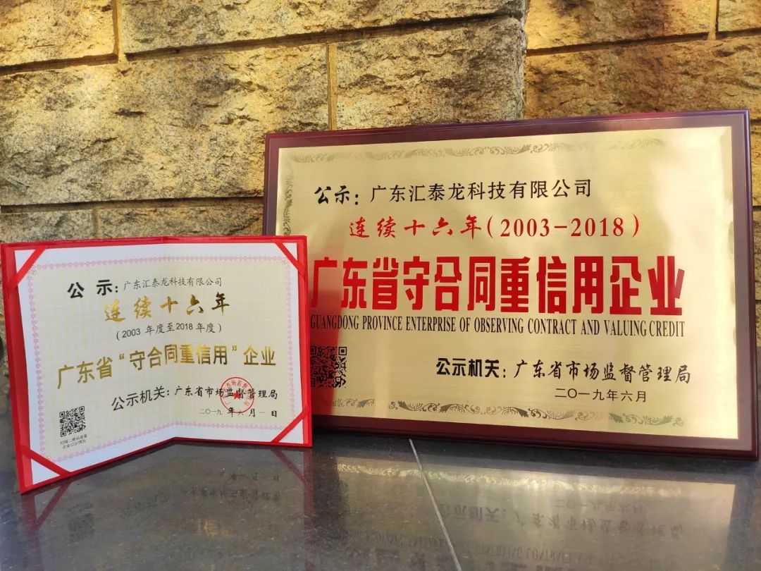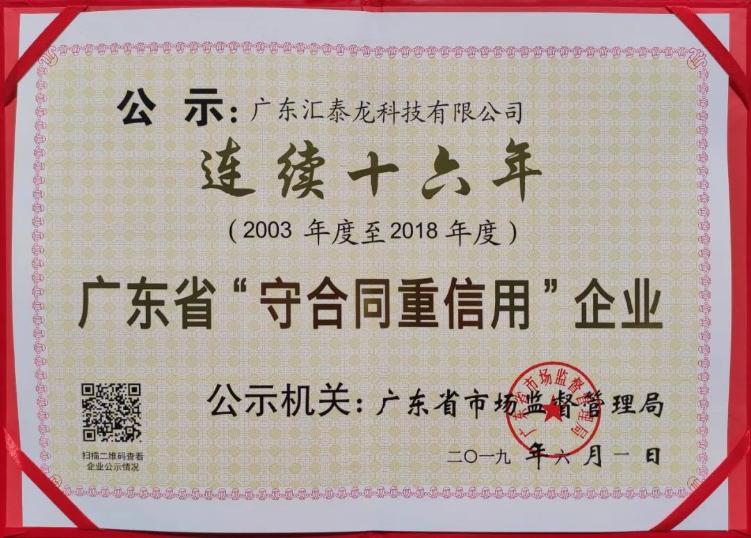 近日,經(jīng)廣東省市場監(jiān)督管理局嚴(yán)格審核并予公示,廣東匯泰龍科技有限公司(現(xiàn)已更名為“廣東匯泰龍科技股份有限公司”)被授予“連續(xù)十六年(2003-2018)廣東省守合同重信用企業(yè)”榮譽(yù)稱號。