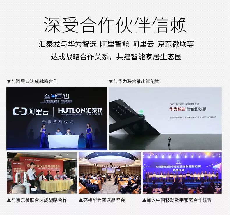 行業(yè)巨頭,精誠合作。2016年,匯泰龍?jiān)趥鹘y(tǒng)的智能門鎖基礎(chǔ)上融入了云技術(shù),率先行業(yè)推出能聯(lián)網(wǎng)、能遠(yuǎn)程監(jiān)控的匯泰龍安全云鎖,并與各大行業(yè)巨頭達(dá)成戰(zhàn)略合作。