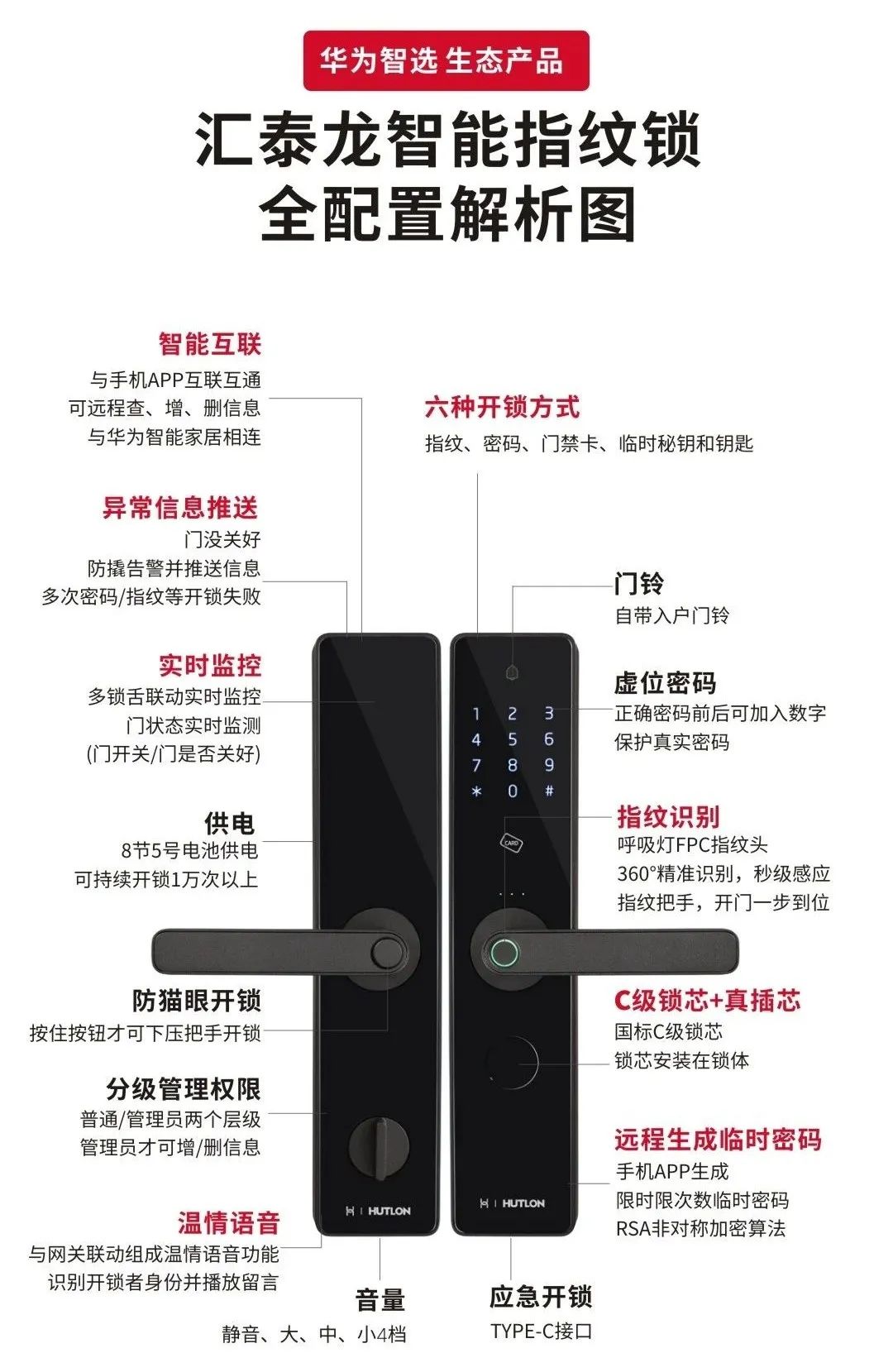 華為智選生態(tài)產(chǎn)品 匯泰龍智能指紋鎖,由匯泰龍與華為智選雙方深度合作共同設(shè)計打造而成。匯聚匯泰龍二十余年的鎖具經(jīng)驗,結(jié)合華為“芯、端、云”等多方面的技術(shù)。