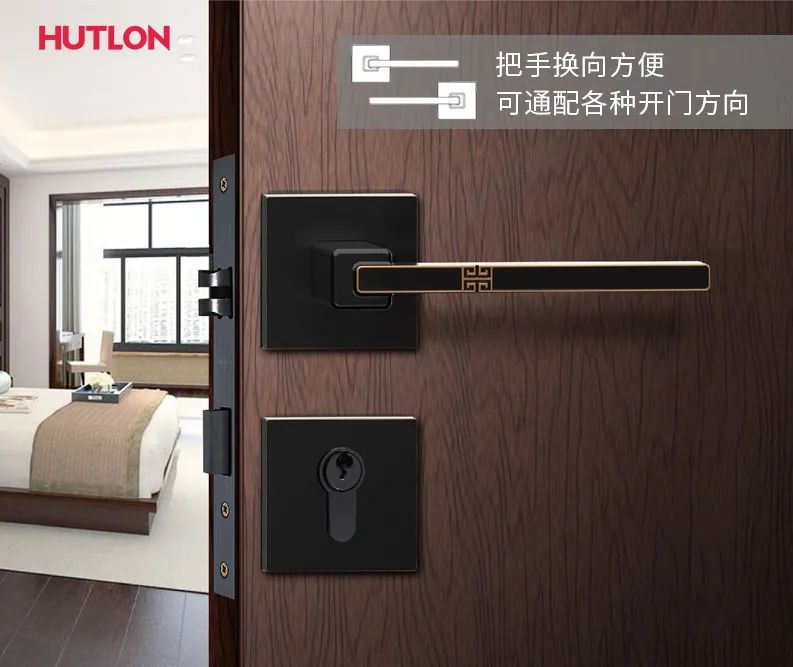 新中式系列分體鎖采用便捷更換把手方向設(shè)計,讓鎖可以通配各種開門方向,減少安裝難度。