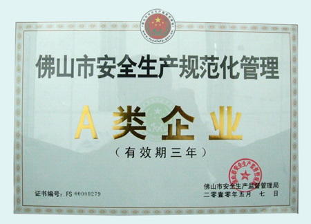2010714上午,在佛山市安全生產監督管理局在全市工礦商貿企業全面開展了安全生產標準化、規范化管理創建工作中,我司榮獲佛山市安全生產規范化管理A類企業證書。此次評審共有180余家企業參加,我公司在此次評定過程中一次性通過審核。
