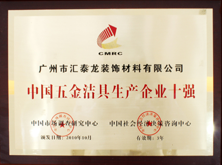 2010年11月,由中國(guó)市場(chǎng)調(diào)查研究中心和中國(guó)社會(huì)經(jīng)濟(jì)決策咨詢中心聯(lián)合組織的“中國(guó)五金潔具生產(chǎn)十強(qiáng)企業(yè)、中國(guó)五金潔具生活十大暢銷品牌”的評(píng)比活動(dòng)結(jié)果揭曉,匯泰龍公司榮膺“中國(guó)五金潔具生產(chǎn)企業(yè)十強(qiáng)”、“中國(guó)五金潔具生產(chǎn)十大暢銷品牌”的稱號(hào),并獲得證書(shū)和獎(jiǎng)牌。這是匯泰龍公司再一次榮獲全國(guó)性的獎(jiǎng)項(xiàng),標(biāo)志著企業(yè)品牌進(jìn)一步得到行業(yè)及消費(fèi)者的充分認(rèn)可。此次的評(píng)選結(jié)果將在《中國(guó)日?qǐng)?bào)》和國(guó)家質(zhì)檢總局主管、中國(guó)質(zhì)檢報(bào)刊社主辦的中國(guó)品牌雜志社以及中國(guó)市場(chǎng)調(diào)查研究中心、中國(guó)社會(huì)經(jīng)濟(jì)決策咨詢中心官方網(wǎng)站予以公布。