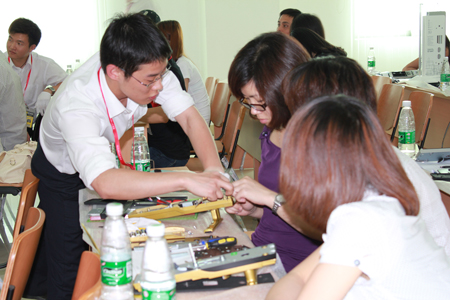 此次的培訓分為多個板塊,分別為:智能鎖市場分析;匯泰龍新產品介紹;操作使用;安裝與調試;售后服務。培訓采用幻燈片演示以及現場實操演練相結合,直觀地再現了匯泰龍智能電子門鎖內部結構和性能特點,從大家的自由的討論中總結匯泰龍新款智能電子鎖的優勢:360度指紋識別、啟動時間不到1秒、時尚的產品外觀設計、雙核雙電路設計等,在實操部分,大
