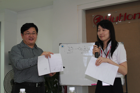 王老師在培訓一開始首先針對“《人性化溝通》課程的十三條前提假設(shè)”和全體學員作了討論和分析,提出十三條改善和提升溝通技巧的黃金法則,同時采取游戲互動的方式檢測兩兩人小組之間的溝通效果,讓在場的所有學員從簡單的游戲中對平時工作的溝通難題迎刃而解。本次的溝通培訓內(nèi)容涵蓋:上級與下級、同事之間、公司和經(jīng)銷商、跨部門之間、銷售人員與顧客的溝通方式,首先大家都提出了幾個比較典型的溝通案例,從討論和分析的角度,對溝通的心態(tài)和方式作了演練和分析,讓在場的學員受益頗多,有一部分參訓學員在課后不無感慨地說“此次培訓是一次改變一生的課”!