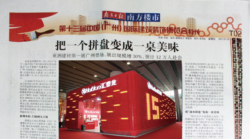 《裝飾商報》摘自陳董在建博會武漢推介會上的講話:作為廣州建博會一名忠誠的合作伙伴,作為一個全國知名的五金衛浴品牌,匯泰龍一直努力打造匯泰龍夯實的企業文化與品牌文化。……置身于這劇烈的國際性市場當中,已有十五年歷史的匯泰龍五金衛浴深知,有品牌才有世界地位!……