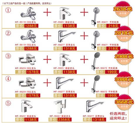 價值 199 元 HF-95672手持花灑一個 (價值 1138 元 HF-95251臉盆龍頭或價值 1318 元 HF-95277廚房龍頭,二款選一)。