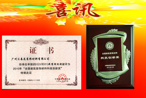 此次會議歷時兩天,在123日下午,中國建筑裝飾協會宣布“全國建筑裝飾材料科技創新獎”和“全國建筑裝飾行業推廣應用產品”名單并頒發獎牌。匯泰龍裝飾材料有限公司在此次會議上分別榮膺四項榮譽:全國裝飾材料行業優秀企業、全國裝飾材料行業科技創新獎、董事長陳鴻填先生被評為“全國建筑裝飾材料行業優秀企業家”,匯泰龍公司產品被評為“全國建筑裝飾行業推廣應用產品”。