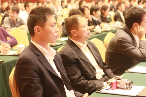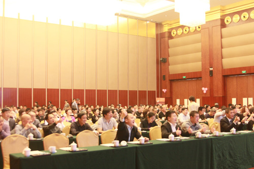 匯泰龍公司總經理徐振忠先生作了主題為《回顧2011,挑戰2012》重要的工作報告,報告內容分為以下七個重要的部分:一、回顧2011年總公司主要工作計劃的執行情況;二、回顧2011年經銷商"如何實現優秀銷售業績"執行情況;三、效益好的經銷商與效益一般的經銷商區別;四、優秀經銷商是怎樣煉成的?五、2012年總公司的營銷思路;六、2012年總公司主要投入與規劃;七、對經銷商的要求。徐總首先利用數據向大家展示了在總公司和全體經銷商共同努力下,匯泰龍品牌取得的可喜成績,接著從生產能力、研發設計、物流供應、供貨能力、品質檢驗、廣告投放等經銷商十分關注的問題作了詳細的工作計劃報告,進一步加強了經銷商對公司未來產品生產、研發、品控、品牌推廣等方面的了解和信心。他還利用非常直觀的方式向大家介紹了決定經銷效益的關鍵性因素。最后,徐總對在座的經銷商們提出了新年度總公司對經銷商在合作共贏、共同發展新的要求和期望。