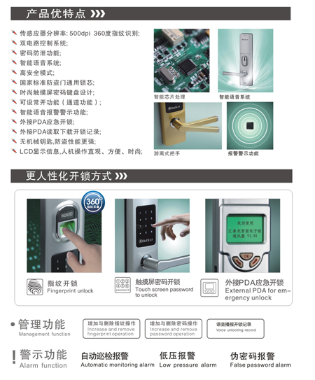 此款智能門鎖以其優(yōu)越的核心軟件系統(tǒng)與指紋掃描技術(shù)、外觀設(shè)計方面表現(xiàn)突出,此款智能鎖外表簡約有力,安裝簡單,環(huán)保節(jié)能-自帶電池可使用5年時間。此鎖設(shè)計簡約大方,線條流暢,現(xiàn)代感極強,迎合大眾審美要求。豐富的表面處理與各式把手的提供可滿足你各種裝修風(fēng)格要求。貼心的幫助系統(tǒng)可讓用戶方便地查詢有關(guān)門鎖,操作,使用等問題。