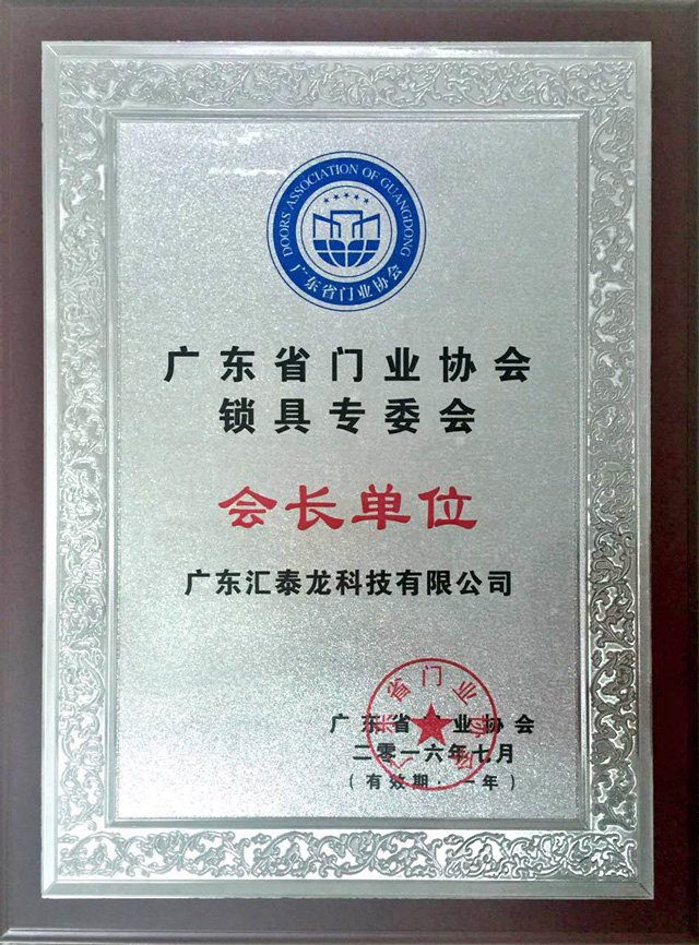 匯泰龍榮獲廣東省門業(yè)協(xié)會(huì)鎖具專委會(huì)會(huì)長單位
