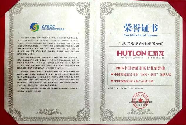 在接下來的2016中國家居業優秀品牌表彰大會上,匯泰龍公司榮獲中國智能家居行業“協同·創新”貢獻大獎、中國智能家居行業產品設計大獎;陳鴻填先生榮獲中國智能家居行業“協同·創新”杰出貢獻人物榮譽!